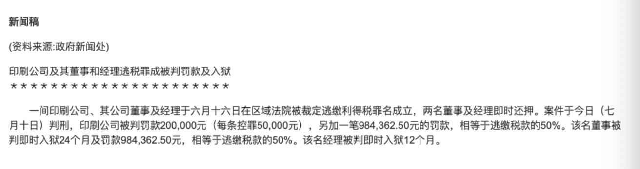 7月份香港政府新聞處發(fā)布一則新聞:《印刷公司及其董事和經(jīng)理逃稅罪成被判罰款及入獄》。具體內(nèi)容為香港一間間印刷公司、其公司董事及經(jīng)理于六月十六日在區(qū)域法院被裁定逃繳利得稅罪名成立,兩名董事及經(jīng)理即時(shí)還押。香港記賬報(bào)稅